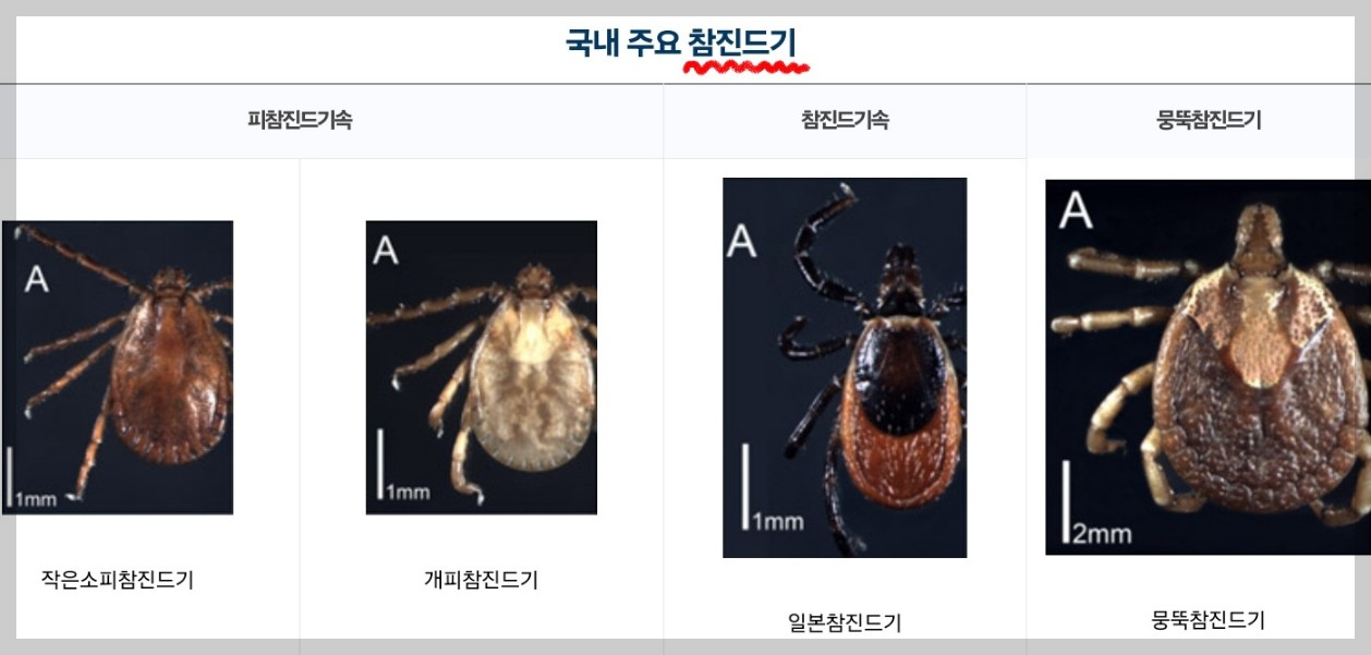 피를 빨아먹어서 빵빵해진 몸입니다. 사람이나 나의 소중한 댕댕이 피를 빨아들인다고 생각하니 정말 박멸해버리고 싶네요. 아래 사진은 국내에 서식하는 주요 참진드기라고 합니다. 진드기는 곤충이 아니라 8개의 다리를 갖고 있는 거미의 친척이라고 하는데요. 그래서인지 징그럽게도 다리가 긴 특징이 있네요. - -;