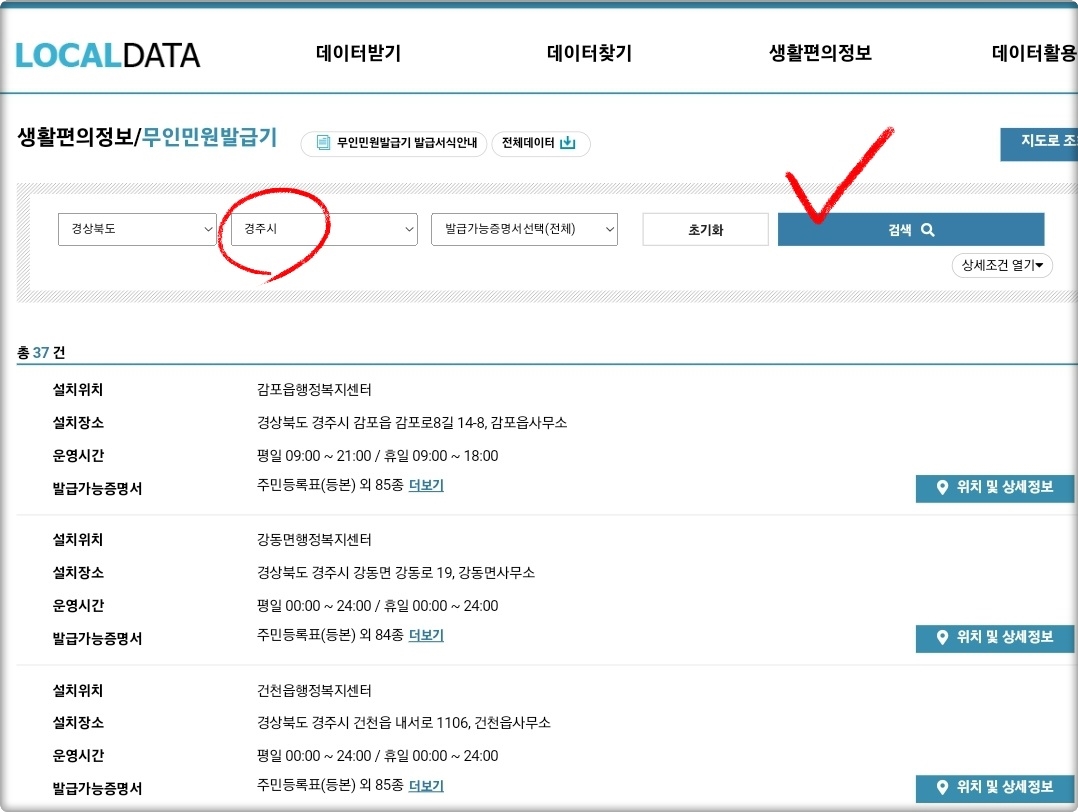 "경주시" 무인발급기 위치는 행정안전부에서 운영하는 '로컬데이터 포털'이 가장 잘 되어 있는 편인데요.