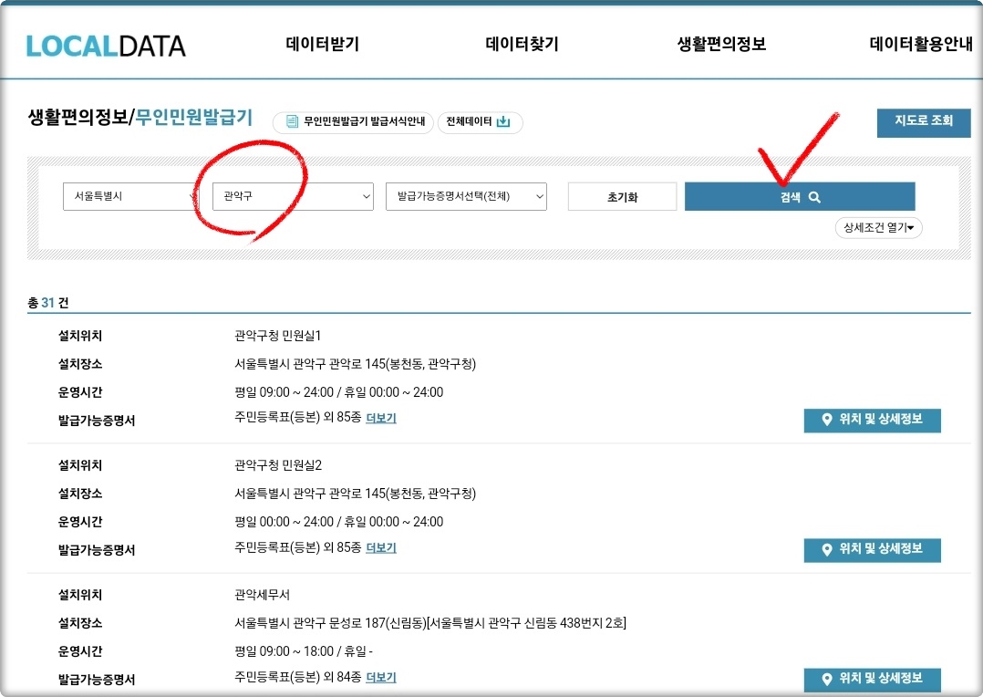 "관악구" 무인발급기 위치는 행정안전부에서 운영하는 '로컬데이터 포털'이 가장 잘 되어 있는 편인데요.