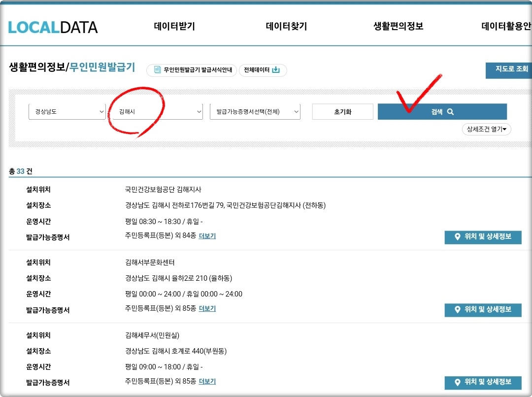 "김해시" 무인발급기 위치는 행정안전부에서 운영하는 '로컬데이터 포털'이 가장 잘 되어 있는 편인데요.