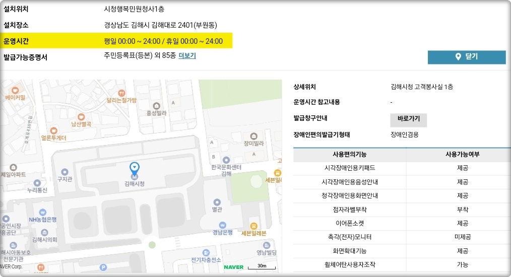 특히 강원 김해시를 기준으로 무인민원발급기를 조회해보니, 설치 장소에 따라 운영시간이 제각각 다르다는 것을 확인할 수 있었는데요.
