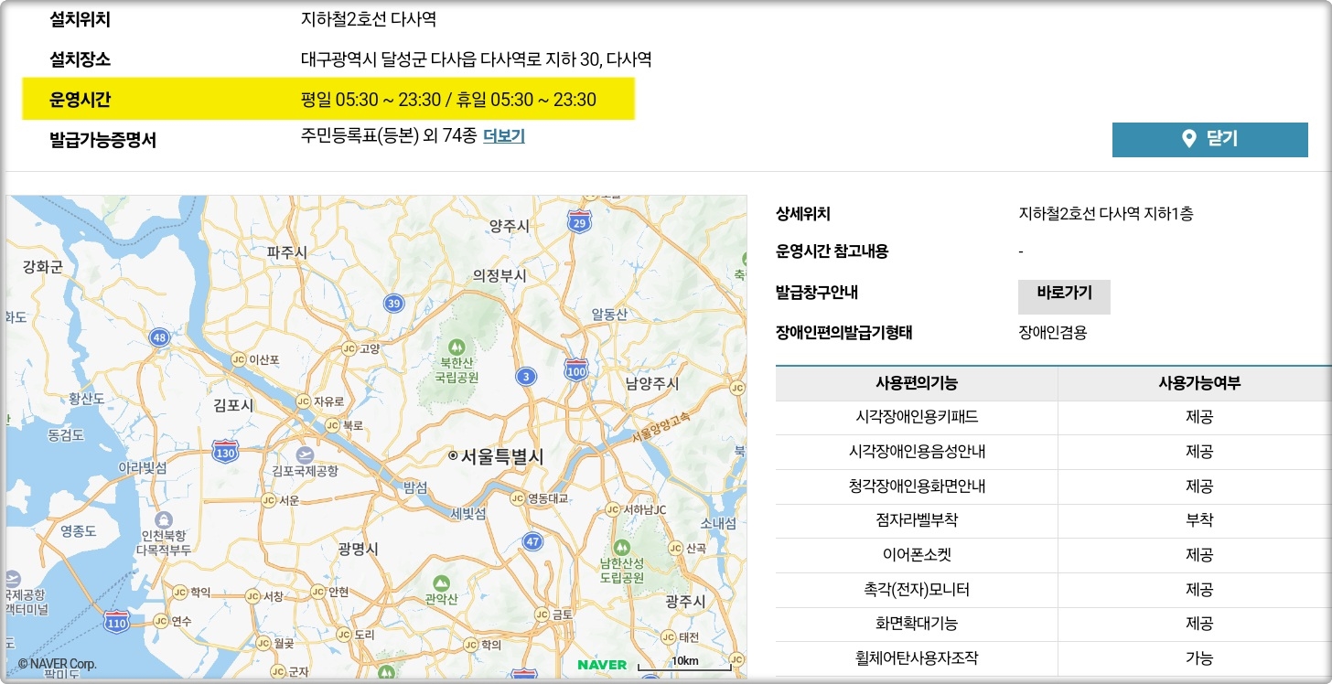 특히 대구광역시를 기준으로 무인민원발급기를 조회해보니, 설치 장소에 따라 운영시간이 제각각 다르다는 것을 확인할 수 있었는데요.