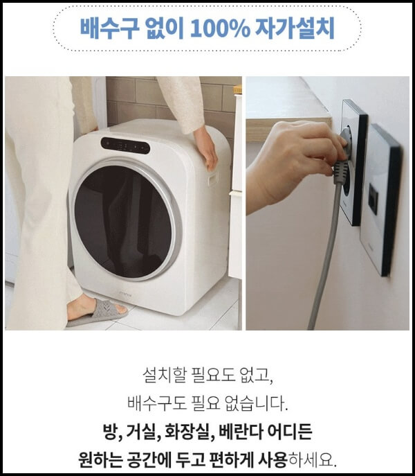 말 그대로 설치랄 게 없고 배수구도 필요 없어서 베란다가 없는 오피스텔이나 원룸에서도 사용할 수 있다는 점이 가장 큰 장점입니다. 여자 혼자서 들기에도 괜찮은 무게이고 간단하게 코드만 꼽아서 쓰면 되기 때문에 굳이 건조기 선반도 필요없어요. 언제든 이사해도 손쉬울 정도로 짐을 가볍게 꾸리는 걸 좋아하는 미니멀리스트에게 특히 추천인데요. 하지만 앞서 얘기했듯이 베란다까지는 아니더라도 창문이 있는 환기가 잘되는 곳에 위치해주는 것이 좋습니다.