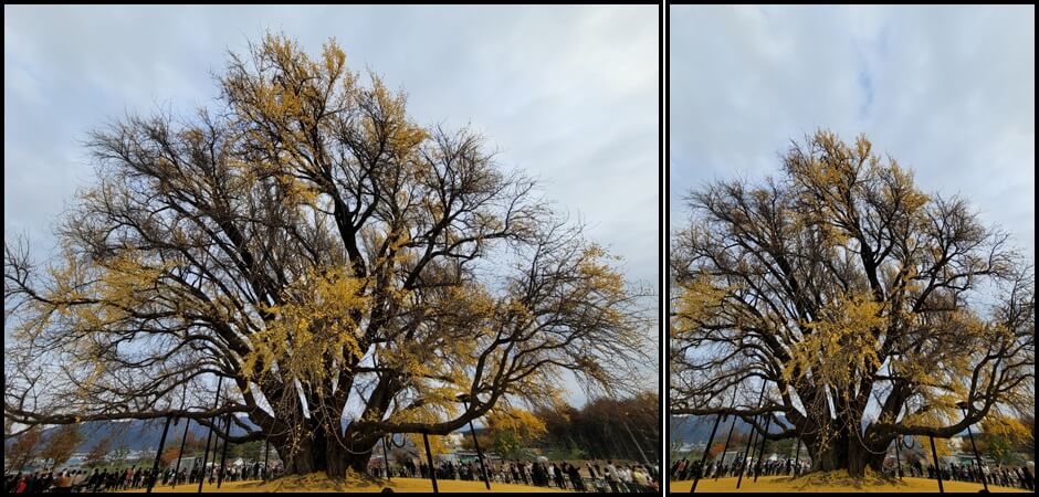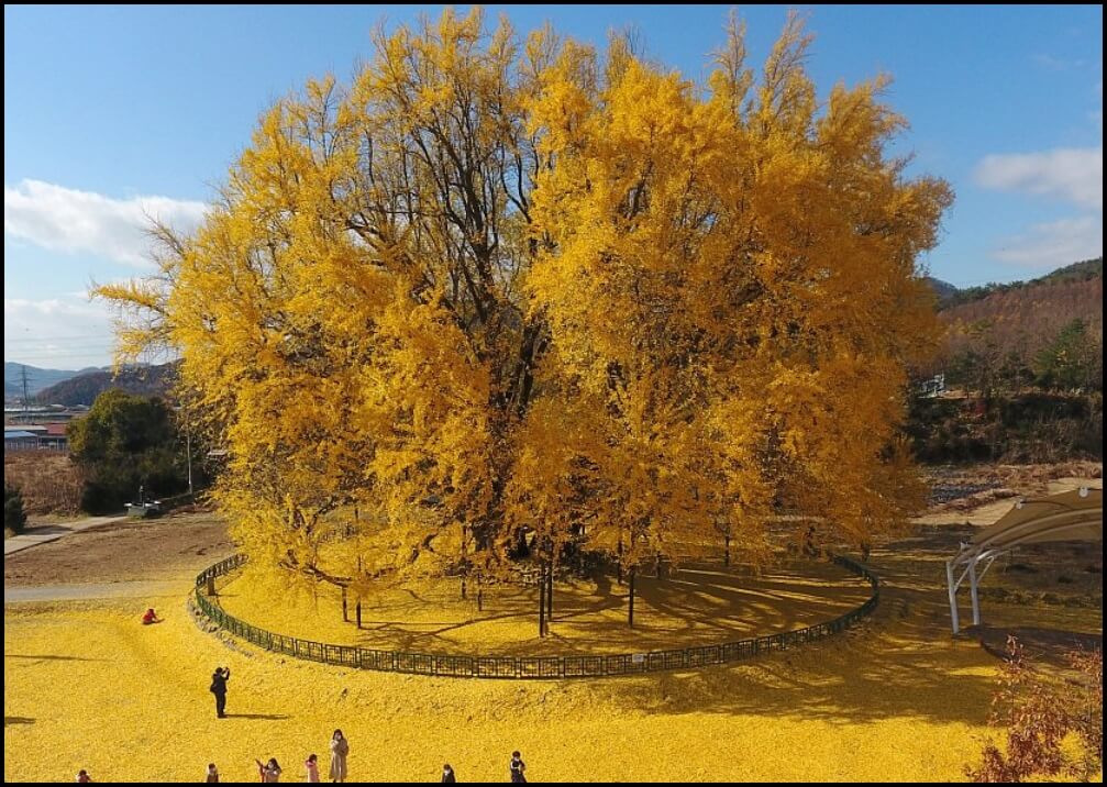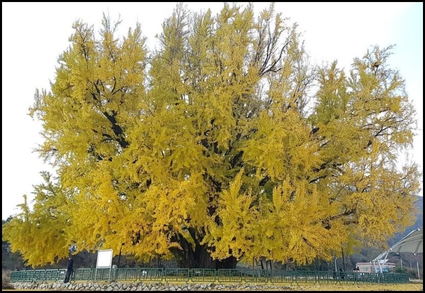 반계리 은행나무의 절정 시기는 10월 중순부터 물 들기 시작해서 10월 말이 가장 아릅답다고 합니다. 단풍이 아주 만개하는 시기에는 이렇게 풍성하게 은행잎이 열린다고 해요. 나무 기둥도 거대하지만 부채꼴 모양으로 촤르륵 넓게 펼쳐진 은행나무 잎도 정말 장관입니다. 우리가 보던 은행나무는 그저 작은 새끼 은행나무였어요.