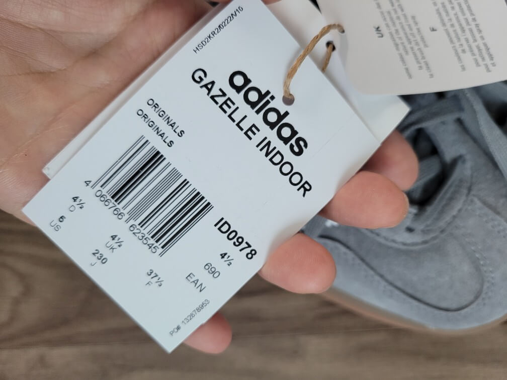 아 그리고 아디다스가 가젤 인도어 제품은 사이즈가 좀 크게 나온 것 같아요. 저 같은 경우는 원래 신발 사이즈가 235로 정사이즈를 신는데요. 아디다스 가젤 인도어는 원래 사이즈인 235 사이즈를 신어보니까 너무 크더라고요? 그래서 한 치수 낮춰서 230 사이즈로 구매를 했더니 편하게 잘 맞았습니다. 230 사이즈는 운동화 발등 부분을 뒤집어서 확인을 해보니 US 5, UK 4 ½ , FR 37⅓, JP 230, CHN 230으로 사이즈가 표기 되어 있었습니다.