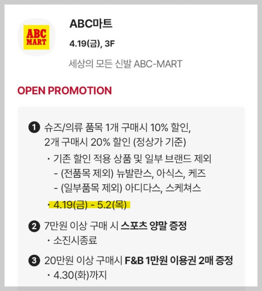 제가 갔을 때만해도 신발이나 옷을 하나를 사면 10% 할인해주는 행사를 진행 중에 있는데요. 만약에 신발이나 옷을 2개 이상 구매할 경우에는 20%나 할인 해주고 있었어요. 그런데 기간이 한정되어 있더라고요. 할인 행사는 2024년 4월 19일 금요일부터 5월 2일 목요일까지만 진행됩니다.