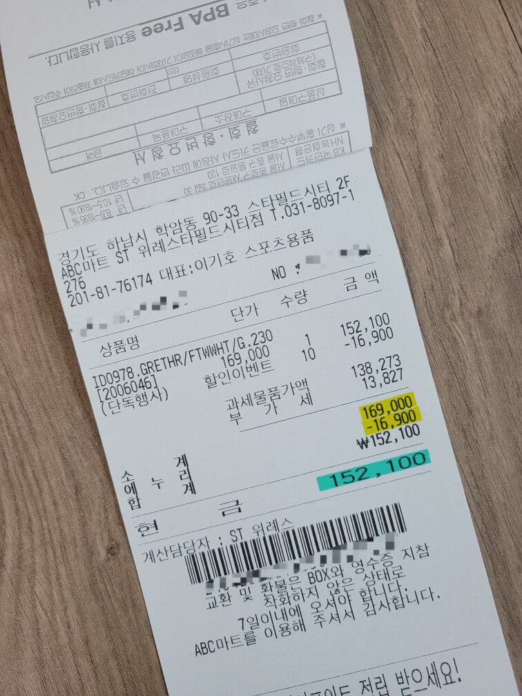 저도 이번에 신규 오픈 할인 행사라고 하니 '오늘이 날이다!' 라고 생각해서 신발을 하나 구매를 했는데요. 예전부터 눈여겨봤던 아디다스 가젤 인도어 제품을 구매했습니다. 아디다스 가젤 인도어는 원래 가격 169,000원인데요. ABC마트 신규 오픈 할인 행사로 10% 할인을 받아서 16,900원 할인을 받았고 총구매금액으로 152,100원을 결제했습니다.