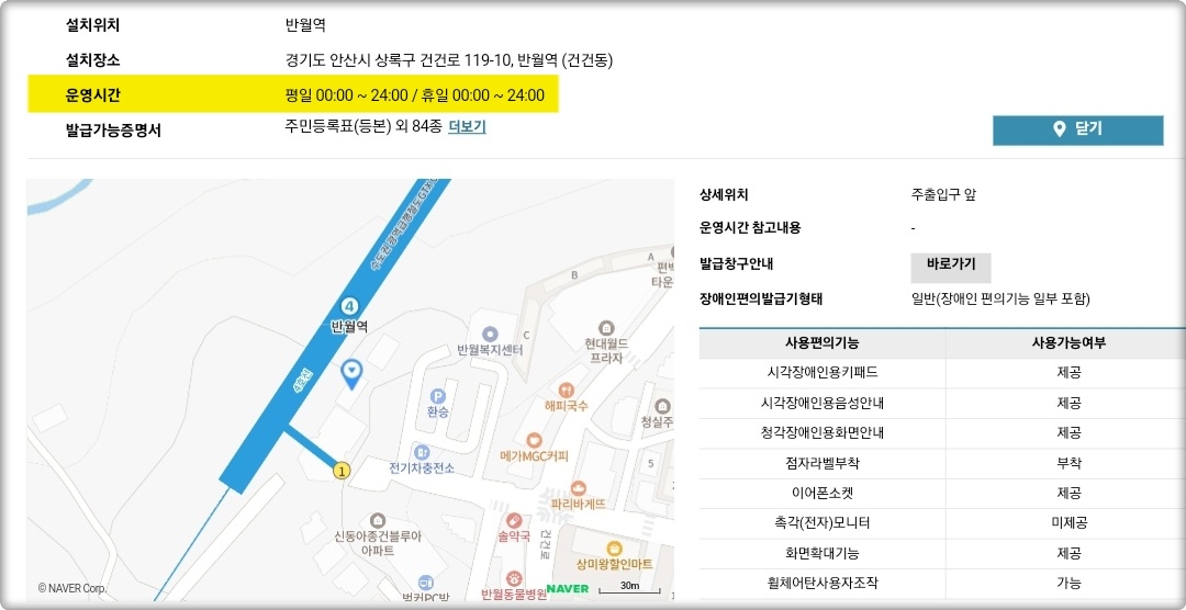 특히 경기 안산시를 기준으로 무인민원발급기를 조회해보니, 설치 장소에 따라 운영시간이 제각각 다르다는 것을 확인할 수 있었는데요.
