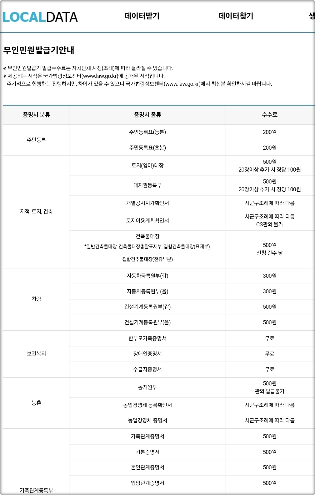 즉, "내가 이 서류를 뽑고 싶은데, 어디로 가야 할까?"를 서류 기준으로 찾을 수 있다는 점이 로컬데이터 누리집의 장점이 되겠습니다.