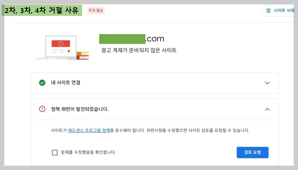 2차,3차,4차 거절사유는 '정책위반이 발견되었습니다.' (1차거절사유는 가치가 없는 콘텐츠 였습니다.)