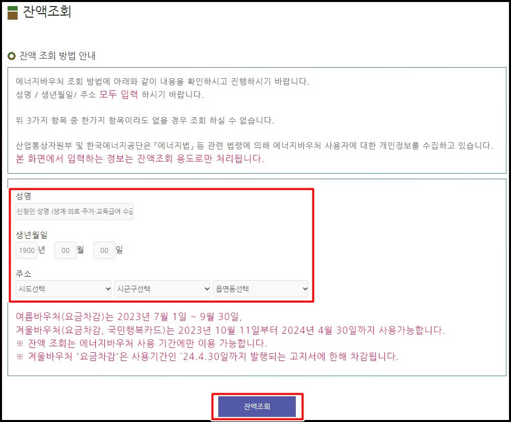 에너지바우처 사용 후 잔액을 조회하기 위해서는 수급자의 성명과 생년월일, 주소 정보가 필요합니다. 위의 에너지바우처 홈페이지에 바로 접속을 하시게 되면 잔액조회방법안내 화면이 뜨는데요. 아래의 보라색 '잔액조회' 버튼을 눌러서 확인하시면 되겠습니다.