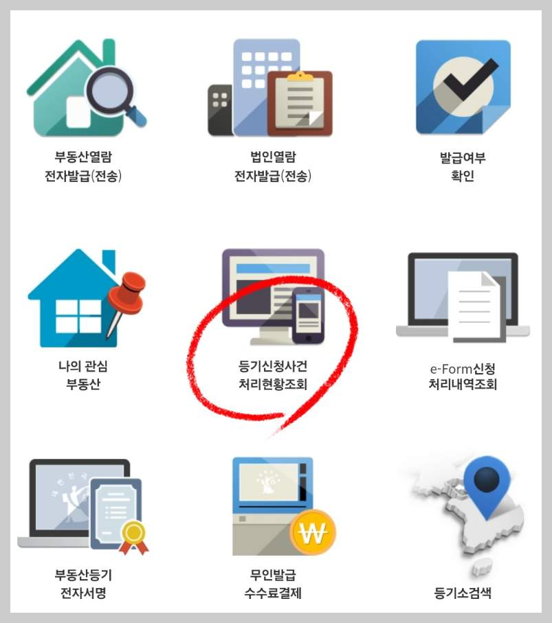 🔻 근저당권 설정을 확인하는 방법 역시 아래의 인터넷등기소 홈페이지나 앱에서 진행하시면 됩니다. 메인화면에서 [등기신청사건 처리현황] 메뉴로 접속하시면 계약하려는 집의 근저당권 설정 여부를 확인하실 수 있습니다.