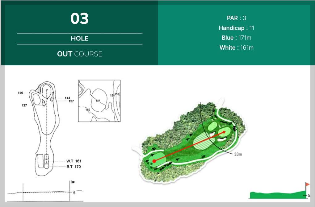 • 종전 티잉 그라운드보다 약 10미터 늘려 파3 홀 중 가장 길며 어렵고, 바람의 방향을 읽어내는 것이 파 세이브에 도움이 된다.