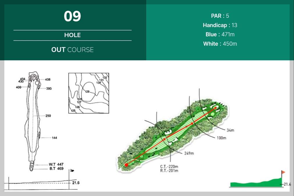 • 세컨샷은 포대그린까지 오르막을 공략해야 하므로 평지에서의 사용클럽보다 1클럽 더 길게 선택하는 것이 유리하다. 약간 2단 형태로 된 그린이어서 3퍼트를 주의해야 한다.