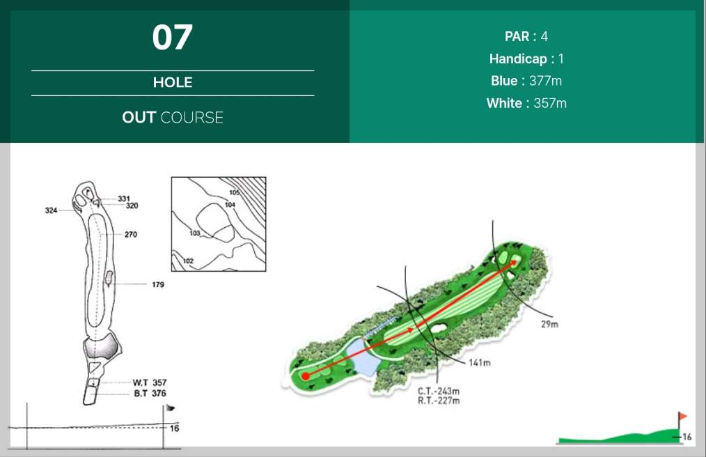 • 티샷이 좌측으로 흐르면 세컨샷이 어려워진다. 세컨샷은 그린 우측 벙커방향이 유리하다. 벙커 앞에서 어프로치샷으로 홀을 노리면 버디를 기록할 수 있다. 우측을 A그린으로 변경했다.