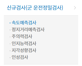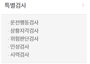 신규검사의 경우 속도예측검사나 인지능력검사 등 다양한 항목을 검사합니다. 그 외 특별검사와 자격유지검사를 볼 때 보는 항목은 아래에서 확인 가능합니다.